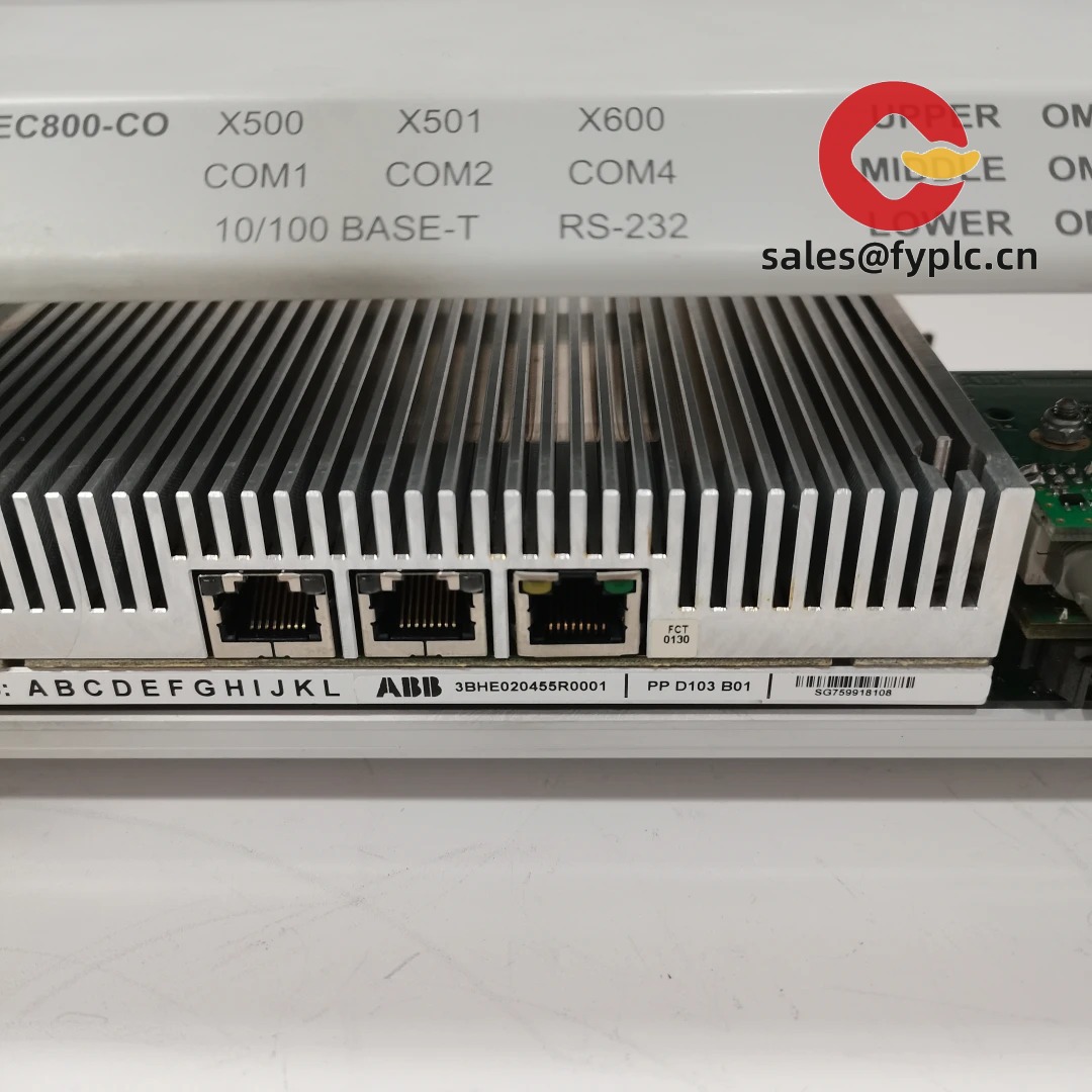 - Integrated dual Ethernet ports (100BASE-TX) — Enables separate control network and engineering interface traffic; supports ABB’s proprietary S800 I/O over TCP/IP and standard Modbus TCP.